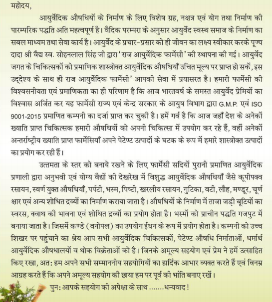 Raj Ayurvedic Pharmacy is a manufacturing and high quality Shastrokat & Patent Ayurvedic Medicine namely Kupipakva Rasayan,Parpati, Bhasm,Pishti,Kharliya,Gutika,Vati,Loh,Mandoor, Chhar and other Shodhit Dravyon.These will be manufectured by latest machine on the basic of centuries-old Ayurvedic System in the supervision of perfect and experienced Vaidyas.